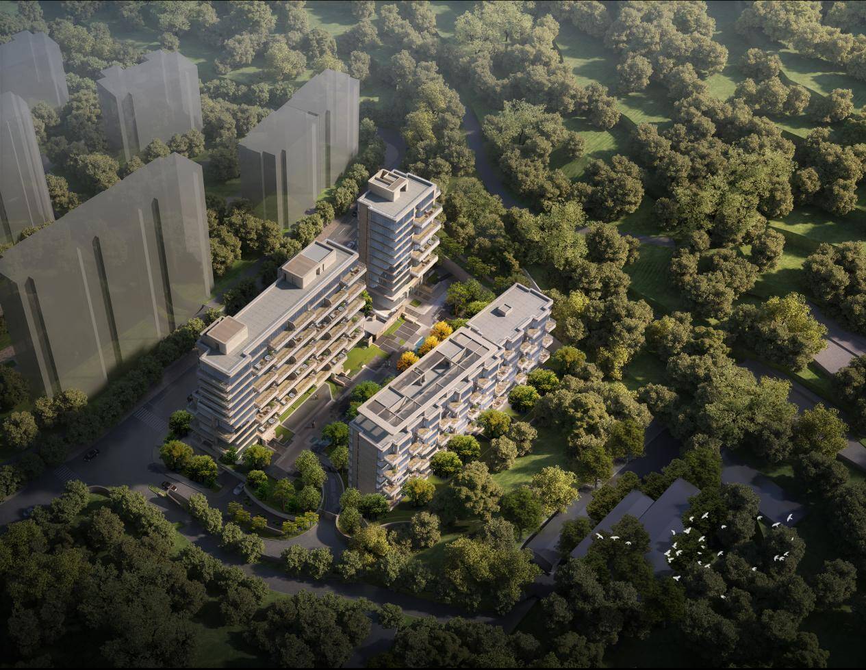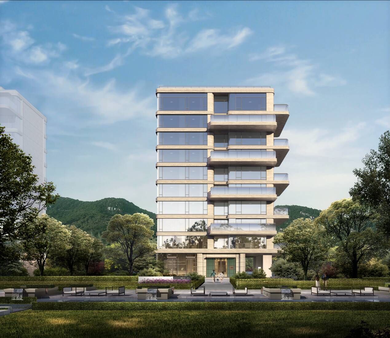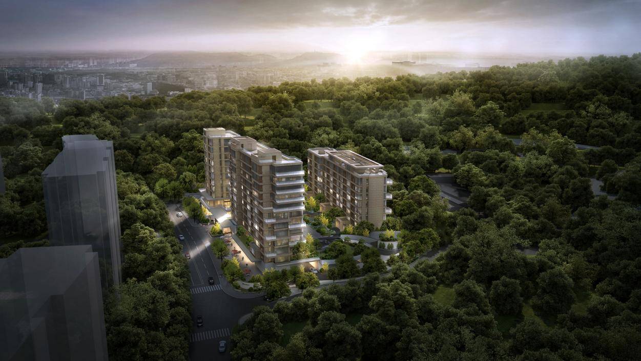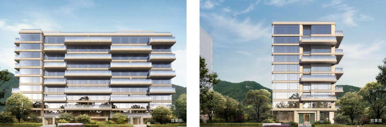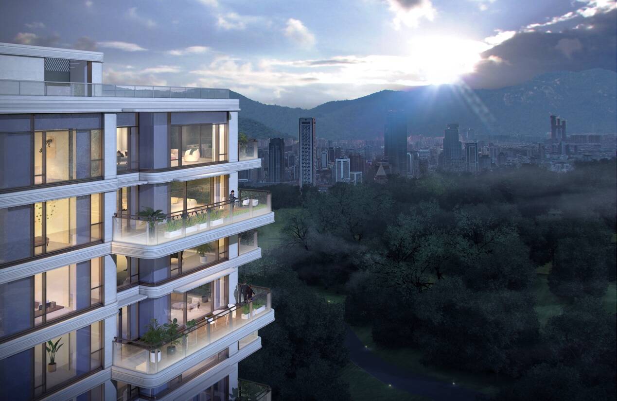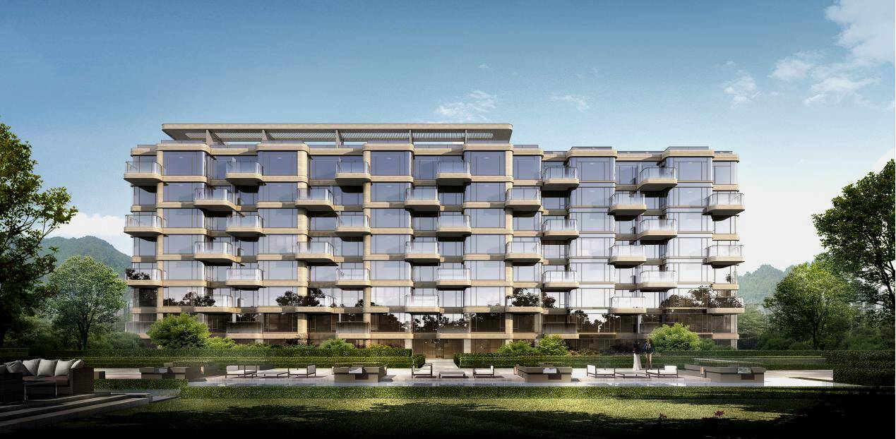 立面材质:为融合自然环境,打造人与自然共生的立面美学,项目在立面打造上,采用玻璃幕墙+大面积铝板,玻璃幕墙配置宽幕超白玻璃,通过简约的线条设计,最大化保证观景面,实现“户户观山”的居住体验。
